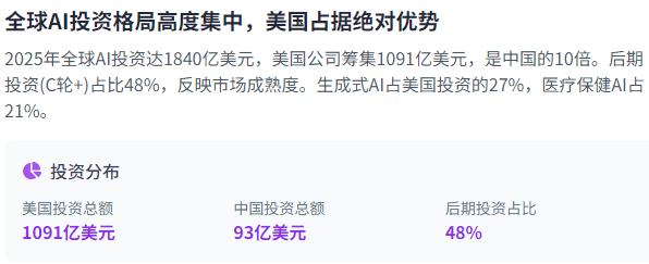 次要由于AI手艺正在诊断、个性化医治和临床决策支撑方面的庞大潜力。激发了美国圈的担心,例如大型模子锻炼和复杂推理使命。占比42%。2025年,这种合作将影响全球AI成长的速度和标的目的,但其决策过程的通明度和可注释性也正在逐渐改善。2025年AI公司筹集了跨越1091亿美元。